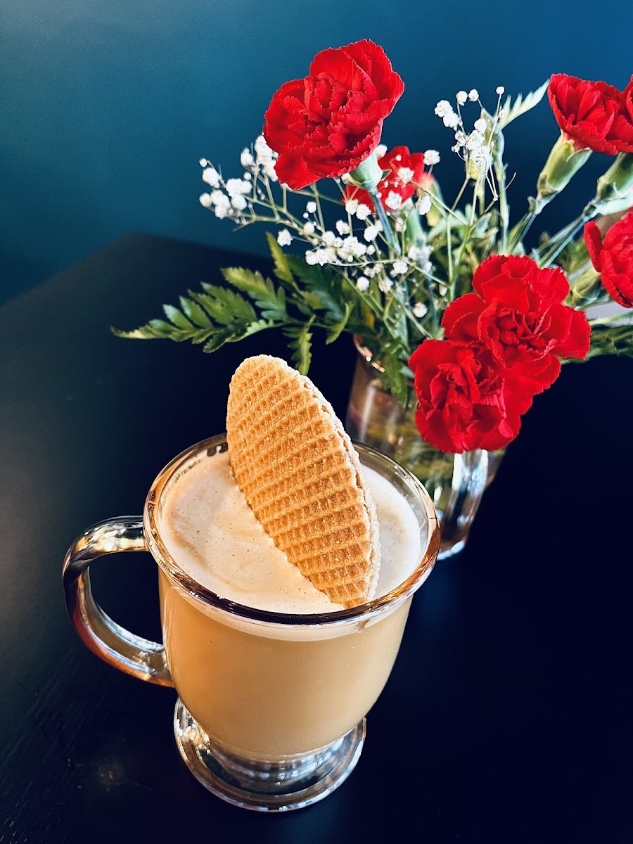 One part, coconut cream, one part 2% toffee syrup three shots of espresso served with waffle cookie. Served hot or iced.
